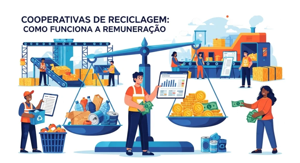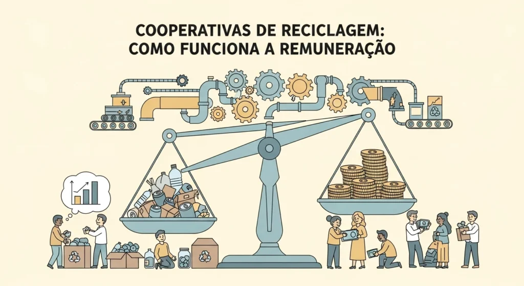 O modelo de remuneração mais comum nas cooperativas de reciclagem é baseado na divisão de sobras ou excedentes. Isso significa que, após a venda dos materiais recicláveis e o pagamento de todas as despesas operacionais da cooperativa — como aluguel do galpão, contas de água e energia, manutenção de equipamentos e combustível —, o valor restante é dividido entre todos os cooperados.